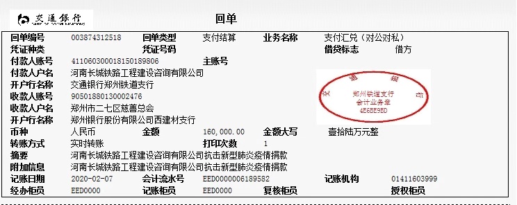 在全国上下齐心协力、众志成城,坚决贯彻落实以习近平同志为核心的党中央决策部署,全面打响疫情防控阻击战的关键时刻,河南长城铁路工程建设咨询有限公司2月7日上午再次召开专题会议对疫情防控工作再部署、再安排,在响应省、市号召做好复工准备工作的同时,号召公司管理层奉献一份爱心,大家纷纷响应,管理层当日捐款10.5万元,公司决定再次捐款16万元,共计26.5万元,于2月7日汇至郑州市二七区慈善总会,作为公司对防控疫情的捐助。1月31日,公司已向郑州市二七区慈善总会捐款8.8万元,公司累计捐款35.3万元。
