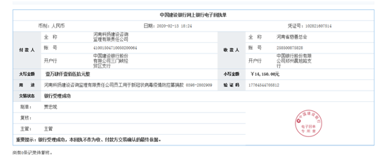 为助力疫情防控,河南科扬建设咨询监理有限责任公司员工主动向河南省慈善总会捐款1.415万元人民币;公司分别向三门峡市慈善总会和三门峡市经济技术开发区各捐款1万元。